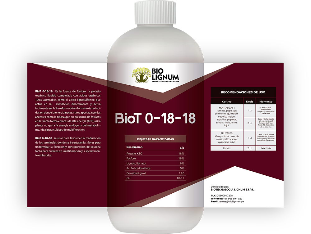 BioT 0-18-18 Es la fuente de fosforo y potasio orgánico liquido complejado con ácidos orgánicos 100% asimilable, como el ácido lignosulfónico que actúa en la asimilación directamente y actúa fácilmente en la transformación a formas más reducidas en donde la energía necesaria es aportada por las azucares como la ribosa que en presencia de fosfatos en la planta forma enlaces de alta energía (ATP), así la planta no gasta la energía endógena del metabolismo. Ideal para cultivos de multifloración.