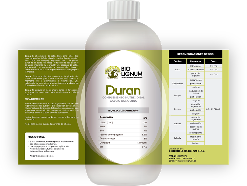Duran Es el complejo de Calcio Boro Zinc foliar ideal para corregir las deficiencias del cultivo. Aporta calcio y Boro como un complejo orgánico para la planta, evitando la caída de flores, fortaleciendo las paredes celulares mediante la formación de pectatos de calcio aumentando la resistencia al ataque de plagas y desintoxicación de la planta aportándole alta energía para la meiosis.