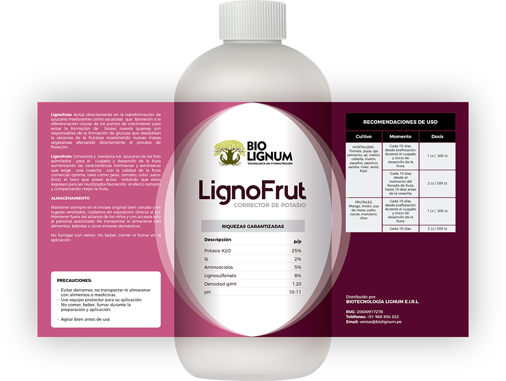 LignoFrut concentra y transloca los azucares de los foto asimilados para el cuajado y desarrollo de la fruta aumentando las características intrínsecas y extrínsecas que exige una cosecha con la calidad de la fruta comercial optima, tales como peso, tamaño, color,sabor (brix), el boro que posee actúa evitando que estos regresen para ser reutilizados favorecido el efecto tampón y compactando mejor la fruta.