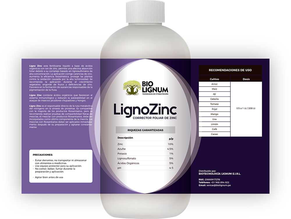 Ligno Zinc este fertilizante líquido a base de ácidos orgánicos con ion de zinc, permite una efectiva absorción foliar debido a su complejo basado en lignosulfonatos de alta concentración. La aplicación corrige carencias de zinc. Aumenta la eficiencia fotosintética, protege las plantas contra la oxidación causada por la alta luminosidad. Se recomienda la aplicación durante el crecimiento vegetativo, engorde de frutos y deficiencias de zinc. Favorece en la formación de sustancias responsables de la pigmentación de la fruta.