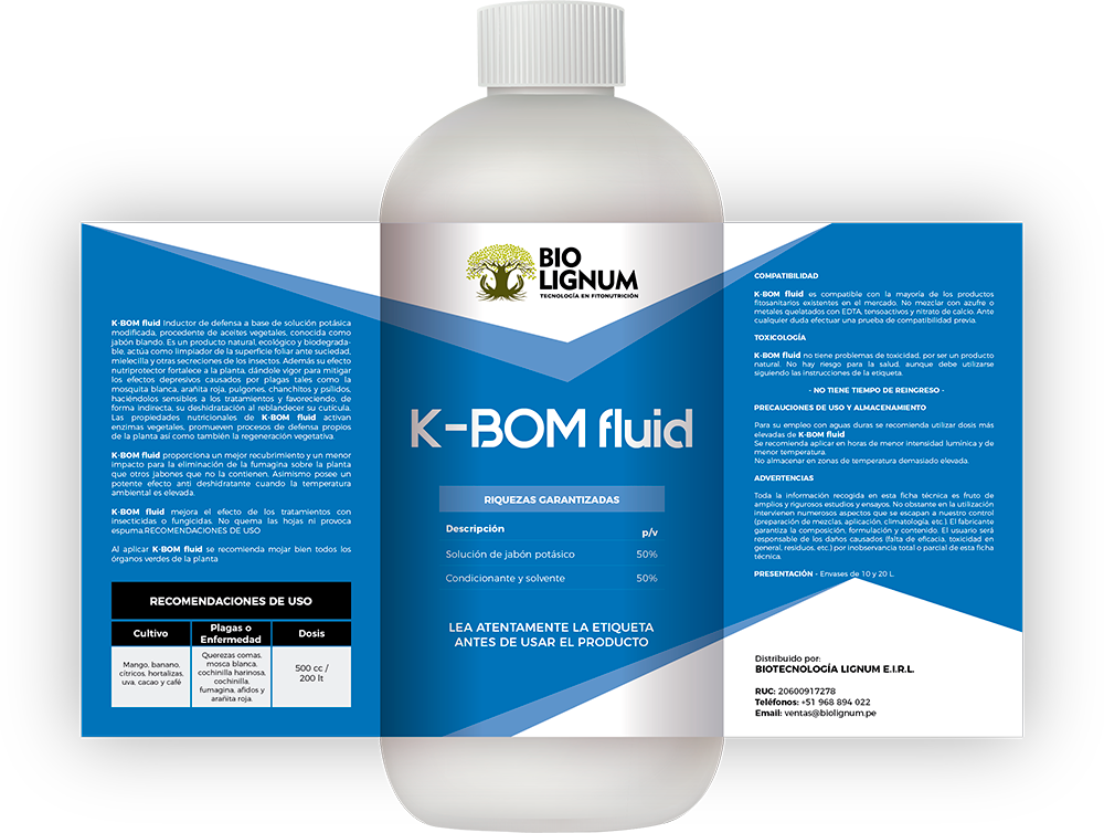 K-BOM fluid Inductor de defensa a base de solución potásica modificada, procedente de aceites vegetales, conocida como jabón blando. Es un producto natural, ecológico y biodegradable, actúa como limpiador de la superficie foliar ante suciedad, mielecilla y otras secreciones de los insectos. Además su efecto nutriprotector fortalece a la planta, dándole vigor para mitigar los efectos depresivos causados por plagas tales como la mosquita blanca, arañita roja, pulgones, chanchitos y psílidos, haciéndolos sensibles a los tratamientos y favoreciendo, de forma indirecta, su deshidratación al reblandecer su cutícula. Las propiedades nutricionales de K-BOM fluid activan enzimas vegetales, promueven procesos de defensa propios de la planta así como también la regeneración vegetativa.
