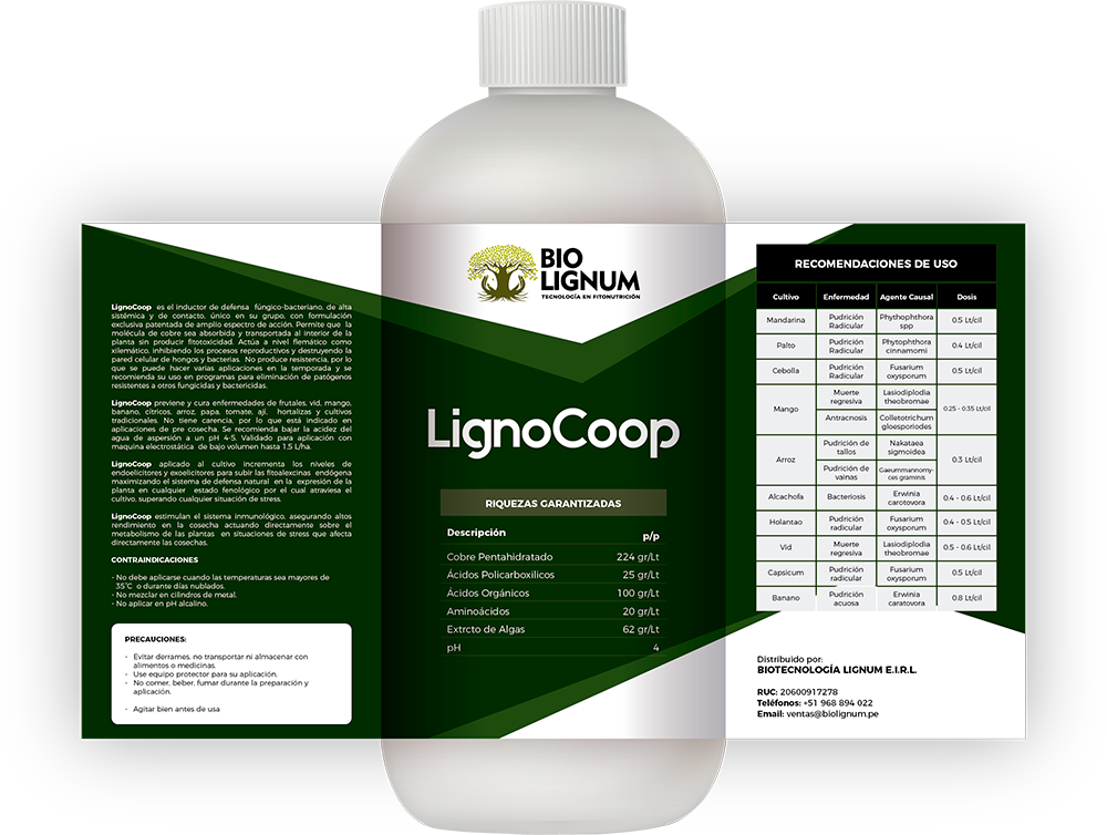 LignoCoop es el inductor de defensa fúngico-bacteriano, de alta sistémica y de contacto, único en su grupo, con formulación exclusiva patentada de amplio espectro de acción. Permite que la molécula de cobre sea absorbida y transportada al interior de la planta sin producir fitotoxicidad. Actúa a nivel flemático como xilemático, inhibiendo los procesos reproductivos y destruyendo la pared celular de hongos y bacterias. No produce resistencia, por lo que se puede hacer varias aplicaciones en la temporada y se recomienda su uso en programas para eliminación de patógenos resistentes a otros fungicidas y bactericidas.